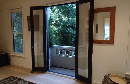 The Living Room has a large luxurious leather couch and Juliet balcony that looks out and over the trees and greenery of the park. The Living Room is complete with a giant Smart TV, Netflix, Bose sound system, Yamaha electric piano and a useful timber desk.