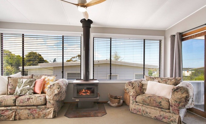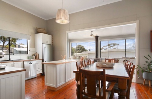 Two living areas, dining room, 2 bathrooms, 3 bedrooms, heating/air conditioning in all bedrooms and living area, plus woodfired heater and back outdoor deck for BBQ's and front verandah with water views - perfectly convenient and very comfortable for a short stay in Metung.