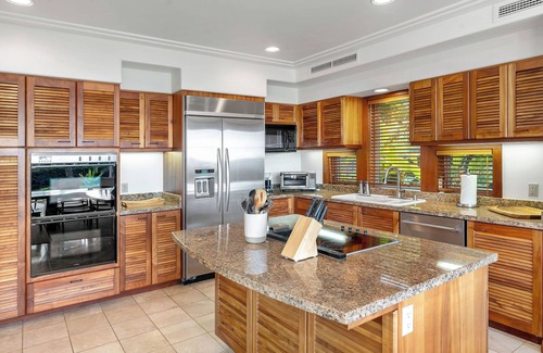 The kitchen is fully equipped with all the amenities a gourmet chef would request: dual ovens, microwave, dishwasher, ice maker, and wine cooler.