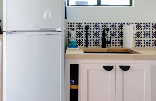 Hues Casita is a complete studio space with king bed, couch, TV with Netflix, and eat-in breakfast bar. The kitchen has an apartment sized stove, oven, and refrigerator and is stocked with the essentials to enjoy a meal. A private sunny patio is our favorite spot to enjoy morning coffee or an evening cocktail.