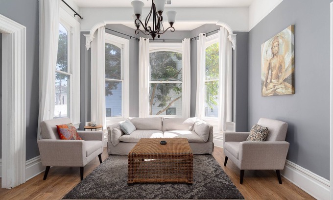 Beautifully restored Victorian with original details. This huge home can sleep 16+! This is an entire duplex with 2 separate 4 bedroom 2 bath units both with chefs kitchens. Sleep like a baby on temperpedic style queen beds. 4 Bathrooms are all full baths and one includes claw foot soaking tub.