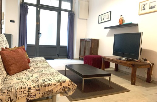 For those that like their space, this huge 95m2 ground floor apartment with private patio is located in the Parallel district of central Barcelona (only 1 metro stop away or 15 mins walk from Las Ramblas). On entering the apartment, you will be welcomed by the main lounge area, containing a large sofa, from which you can relax or watch TV. Moving on, the central portion contains a dining area, and an adjoining American styled kitchen, which is fully equipped, and contains a gas cooker and oven, microwave, toaster and kettle. Further along, you will find a bright bathroom with bath tub and shower, next to which there is a single bedroom, and a bright bedroom with double bed. The indoor patio towards the end has an adjoining room for the washing machine, and, via the large double glazed patio doors, leads to a sunny 20m2 split level patio, which contains a table and seating for 3 people.