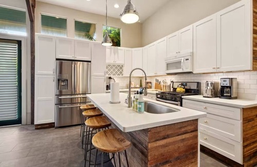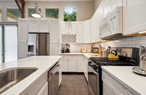 Recently restored, you will love this 1920s home features 14 fireplaces, exposed wood, brick and hard-wood floors throughout. This 5br/4ba house spans 3,000 square feet and is decorated with a blend of vintage and mid-century modern furniture. Mahogany black-out shutters allow for the perfect sleep. Relax further in the backyard with a brand-new heated pool, hot tub, and shaded pergola. Please refer to floor plan for accurate depiction of bedroom count and layout.- Backyard with brand new heated pool, hot tub, courtyard, grill and outdoor dining area.