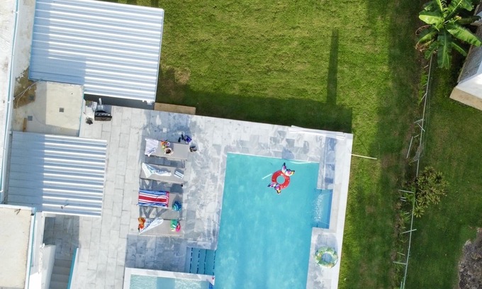 As you step into our oasis, the focal point is a large in-ground pool, creating a haven for relaxation. The pool boasts a mesmerizing 5-foot waterfall, adding a touch of serenity to the vibrant atmosphere. Adjacent to it, discover a kiddie infinity pool featuring a charming 2-foot waterfall, perfect for our younger guests to enjoy.