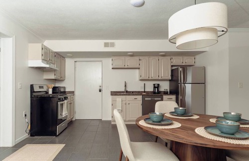 The heart of the home is the open-concept kitchen, fully stocked with stainless steel appliances — including a full-size refrigerator, oven, microwave, and dishwasher — as well as all the cookware and utensils you might need. Just beside it, the dining area offers a warm, wood-toned round table set for four, perfect for meals, conversations, or a board game night.