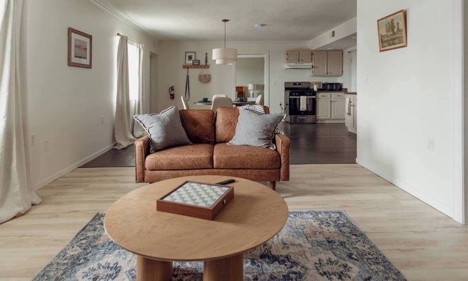 The living area is cozy yet stylish, featuring a cushioned loveseat, two comfortable chairs, and a sleek smart TV mounted for easy viewing. The two chairs each open into twin-size beds--great for additional guests or kiddos tagging along for the trip. A wooden coffee table and soft area rugs complete the space, making it an ideal spot to unwind after a day of exploring. For those travelling with infants, we have also included a pack-n-play in your closet, as well as a high chair for meal times!
