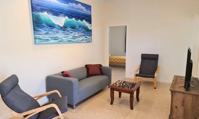 This private, self-contained unit has 2 bedrooms and accommodates up to 5 guests - A spacious main bedroom with a queen bed and an extra single bed, And an additional, cosy secondary bedroom with a queen bed. It includes a small kitchen with fridge and microwave, bathroom with shower, dining area and a living room with dimmable lighting. You’ll have your own car space in a shared lockable car park behind the building for ease of access.