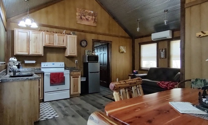 We offer 720sq ft. of space for the whole family. 2 bedrooms with extra cots, walk in closets, stand up shower, washer/dryer, fridge, microwave, full stove/oven, coffee pot, cooking pots, dish-ware, a/c / heat in each room. Eat in kitchen with Amish made dinette set. Couch that folds out to make bed. Outside smoke-less fire pit with grill option. No pets Unless approved