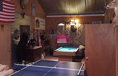 Rustic Hunting Cabin has with two bedrooms. One bedroom consists of two twin beds and the other bedroom has one queen bed. Furnished kitchen with electric range, microwave, dishwasher, plates, utensils, refrigerator, sink. Game room has pool table and ping pong. Trophy/living room has wood burning fireplace, coach, chairs, dining table. Small bathroom with sink, 3' x 3' shower, and toilet. Porch has outdoor charcoal grill, with chairs and swing overlooking woods and lake. Saddle up bar area with electric fireplace.