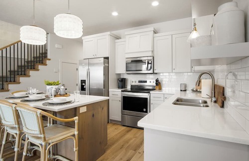Spread out across two floors, the generous open floor plan combines space with connectivity, giving your group room to move around while bringing you back together for memorable moments. The first-floor living area provides comfy sofa and armchair seating with views to the outdoor patio as well as the mounted smart TV. Continue to the dining room where you’re met with an elegant dining room table and chairs with seating for 5. Additional seating for 4 can be found at the kitchen counter with creamy white countertops and cabinetry. Stainless steel appliances complete the fully equipped kitchen, where the option to cook or prepare takeout is yours.