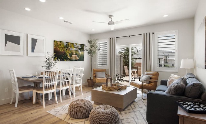 Hygge House is located in beautiful Freedom Village. Just 4 minutes from the brand-new Red Cliffs Temple, this enviable location is in close proximity to Zion National Park, St. George Regional Airport, downtown St. George, and dining and shopping. Freedom Village boasts a 2,000 square foot beach entry pool, hot tub, pickleball court, children’s playground, and RV parking. Sand Hollow State Park is only 18 minutes away (rated as one of the most popular state parks in Utah).