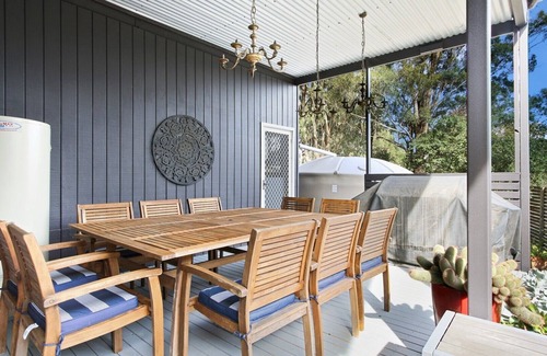 The fully equipped galley kitchen includes a dishwasher, Nespresso pod machine, drip coffee percolator, electric oven, and gas cooktop. Entertainment options comprise multiple TVs, a DVD player, complimentary Netflix, board games, a book collection, and a PlayStation game console. Additional amenities feature Wi-Fi, air conditioning, ceiling fans, an outdoor firepit with chairs, and a BBQ area suitable for entertaining. The property also provides a porta cot, high chair, two adult bikes with helmets, and an exercise bike. Please note, pets are not permitted, and beach towels are not provided.