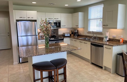 The gourmet kitchen comes fully equipped with stainless steel appliances, granite counter-tops and Italian cabinetry - everything to satisfy your culinary tastes. The dining, and open beam living space comes beautifully furnished with Island detail and includes flat screen HD television, Blu-Ray DVD player and secure Wi-Fi. The layout is perfect to ensure your guests are always a part of the conversation.