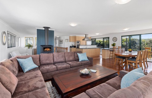 Teewah Tranquility is designed to offer the utmost in comfort and style, with spacious living areas, surrounded by sliding glass doors and windows that flood the interiors with natural light. The open-plan living and dining area upstairs is the heart of the house, with a large, comfortable 10 seater couch and 2 dining tables, one inside and one on the deck, both of which can seat 10 guests. Downstairs has a totally self-contained area which can accommodate 4-6 guests. The fully equipped kitchens feature everything you need to cook up gourmet meals. In winter, cosy up next to the central fireplace, or enjoy socialising around the outdoor fire pit.