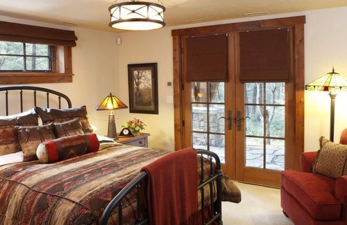 Room 1: This is the master bedroom on the main floor. It has a king-sized bed, its own master bathroom complete with in-floor heating, giant walk-in closet, TV, a wood burning fireplace with gas assist and a balcony that connects to the outside grill area.