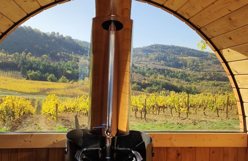 The sauna is in the middle of nature, in the middle of the vineyards, and enjoys a soothing view.