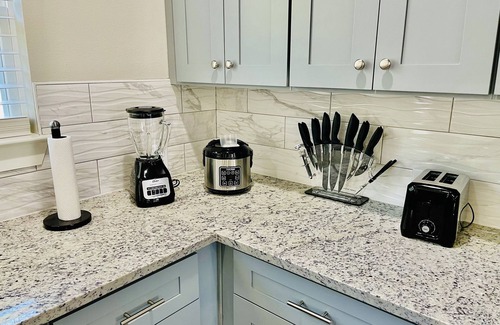 Mid century modern vibes welcome you into this 3 bedroom, 2 bath home with an outdoor deck and fenced-in backyard. This home is located minutes away from all the vibrant sites in downtown San Antonio! Kitchen features all essentials to make your home cooked meals. Enjoy your morning cup of coffee on the back deck. Comfort is the word for each bedroom and wind down in the spa-like bathrooms! Fast Wi-Fi and smart televisions with cable available! My home is cleaned by a certified cleaning company after each guest! Off site laundry services available less than 1 mile away. Please contact me for details. One parking space available in driveway. Free street parking available. Two cameras by front door facing outside and one camera in the back of house facing the deck.
