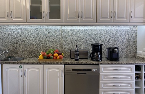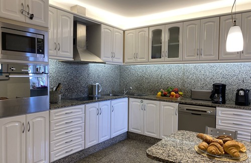 The kitchen is spacious, has marble counters and a table and is fully equipped with: