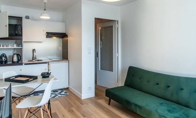 The apartment also has practical amenities for your comfort, such as free Wi-Fi, a flat-screen TV, a hairdryer in the bathroom, and a bike storage room in the residence.