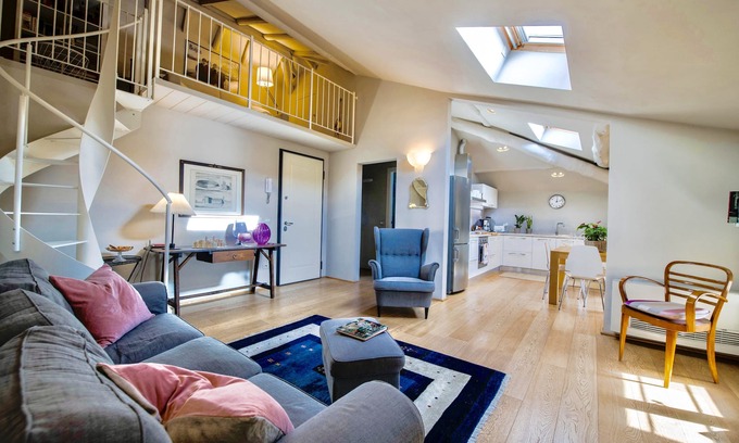 The apartment is renovated from an old attic located in an art nouveau building. The owners have transformed it into an elegant attic equipped with all comforts. The décor is characterized by the right balance between modern and old that makes it friendly and allows you to enjoy a pleasant stay for all your needs.