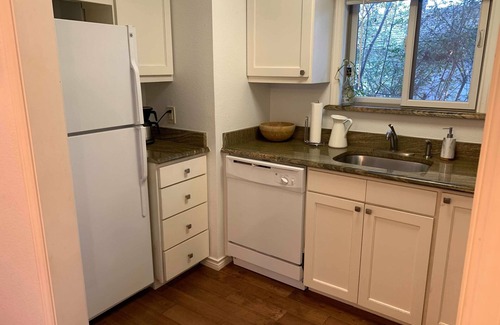 The Idiot's Hill Guest House is surrounded by established trees and lots of natural light. The kitchen is well supplied for your time in Denton with an oven/stove, refrigerator, dishwasher, coffee pot, washer/drier and kitchen utensils. We have fast wifi and a Roku for netflix, hulu or any subscriptions you have.