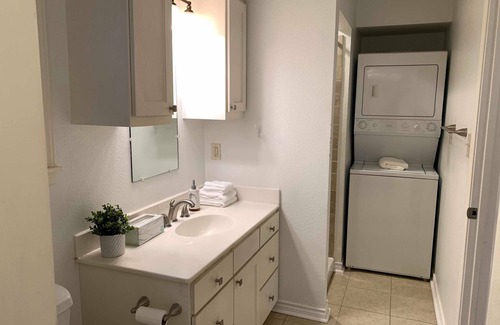 You will have full access to the private and detached guest house. You have your own driveway which leads down a lighted path on the side of the house leading to the guest house. You will be sent the code for the lock prior to your arrival. You will have private access to all aspects of the guest house including the Living Room, Bedroom, Full Bathroom, Dining Area, Kitchen, as well as a laundry area complete with a washer and dryer. As we live in the main house in front with our children, you will not have access to the backyard.