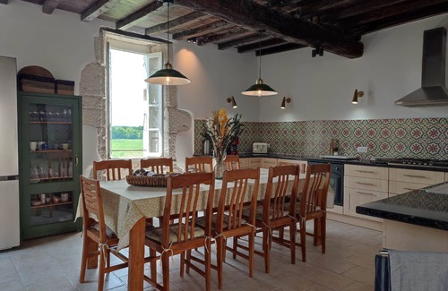 Our larger villa, Le Prunier, invites you to discover its warm and relaxing atmosphere. The spacious kitchen with a table that seats ten is perfect for gathering and sharing meals together. The living room, complete with a TV with Chromecast for streaming and a Bluetooth speaker, offers a cozy retreat for your entertainment needs. Both the kitchen and living room feature wood burners to keep you warm during cooler months, while the stone walls help maintain a pleasant temperature in the summer. A double bedroom on the ground floor features an en-suite bathroom.