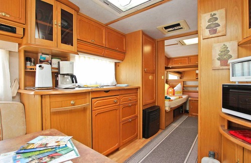 The approx. 34 m² non-smoking caravan is equipped with two single beds, a functional kitchen (radio, gas cooker, fridge, microwave, mini oven, various small kitchen appliances, please note: no drinking water!), a seating and dining area (can be converted into two additional beds), a large awning (swing, dining table, sun loungers) and gas heating/air conditioning.