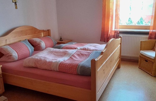 Idyllische Feld- und Flurwege rund um unser Dorf laden ein, zu erholsamen Spaziergängen oder ausgedehnten Wanderungen. Ausflüge in verschiedene Domizile des Bayerischen Waldes, z. B. Nationalpark, Freilichtmuseum, Glaskunststätten, Rodelbahnen und Waldwipfelweg oder nach Tschechien bieten Abwechslung. Nach einem aufregenden Urlaubstag erwartet Sie unsere geräumige ebenerdige Ferienwohnung in Südlage. Der Wohn- / Essbereich ist ausgestattet mit einer Küchenzeile, einer Eckbankgruppe sowie einer Couchgarnitur. In der Küchenzeile finden Sie alles was Sie brauchen - einen Backofen, eine Kaffeemaschine, einen Kühlschrank, einen Toaster, Geschirr und Besteck.In der Wohnung befinden sich zwei Schlafräume, wovon eines als Elternschlafzimmer mit einem Doppelbett und eines als Kinderzimmer mit Etagen- und Einzelbett, eingerichtet sind. Das Bad ist mit rollstuhlgerechter Dusche und WC ausgestattet. Direkt vor den Wohnungen können Autos kostenfrei geparkt werden. Die Wohnung wird über eine breite, überdachte Terrasse erreicht. Diese lädt ein zum Frühstücken im Freien, zum nachmittäglichen Kaffeetrinken oder für gesellige Runden am Abend.