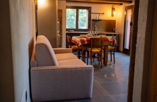 Gli interni della casa sono caldi e accoglienti, con dettagli caratteristici in legno e in pietra. È composta da una camera matrimoniale, un salotto con divano letto, due bagni e due ingressi: uno al piano terra e l'altro al piano inferiore. Nei pressi della struttura è anche presente un parcheggio gratuito.