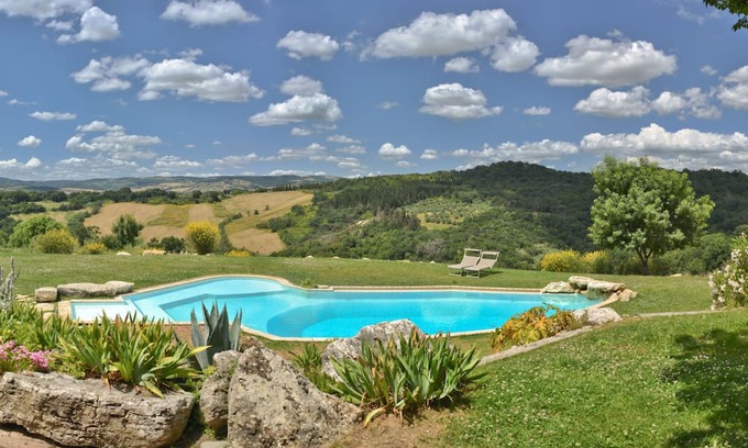 A villa of great charm in southern Tuscany, on the hills of Maremma and not far from the sandy beaches of the Tyrrhenian Sea. Completely immersed in the typical nature of Tuscany, it awaits you in an incomparable panoramic position very beautiful villa "Il Casale", 3 storeys, surrounded by trees and meadows. 1 km from the centre of Saturnia, in a secluded, quiet position, 50 km from the sea, 50 km from the beach, in the countryside. Private: park, beautiful garden to relax, swimming pool (15 x 8 m, seasonal availability: 01.May. - 30.Sep.) with internal staircase. Unconventional pool shape. Paddling pool, pergola, terrace, garden furniture, barbecue. In the complex: reception. 1 km long motor access (via unmade road). Parking on the premises. Grocery 1 km, supermarket 16 km, restaurant 1 km, sandy beach "Albinia" 48 km, thermal baths "Saturnia" 3.5 km. Golf course (18 hole) 5 km, walking paths from the house 10 m. Nearby attractions: Manciano 5 km, Pitigliano 27 km, Monte Amiata 30 km, Scansano 30 km, Grosseto 58 km. Well-known lakes can easily be reached: Lago di Bolsena 50 km. Please note: car recommended. Local sale of farm products.