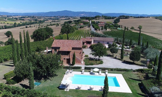 Il Fitto is located near one of the most enchanting places of all Tuscany, Cortona, one of the oldest Etruscan towns in the region, perched on a hilltop 600m above sea level and dominating the Val di Chiana. It enjoys a secluded position, on a hill with splendid views over the rolling landscapes that characterise the area and the skylines of the little borghi that dot the surroundings. The structure stands within an old renovated farm estate, composed of a main building and an annex, furnished in classic Tuscan style and with air-conditioned bedrooms. The house is protected by a beautifully well-kept park and is guarded by a garrison of olive trees and by the vineyard that frames the large exclusive swimming pool. The estate, which extends for more than fifteen hectares cultivated with olives and vines, produces an exceptional extra virgin olive oil and a prestigious nectar in the varieties Syrah, Sangiovese and Vin Santo DOC Cortona, which the owners will be happy for you to taste in the cellar adjacent to the house. Equidistant from Cortona and the famous borgo of Montepulciano, the location of Podere Il Fitto will allow you to combine visits to the numerous art cities and the beautiful historic borghi of Tuscany and the neighbouring region of Umbria with restorative stops at the countless spa establishments in the immediate surroundings (Montepulciano, Rapolano and Chianciano Terme), which represent the point of excellence of this part of Tuscany.