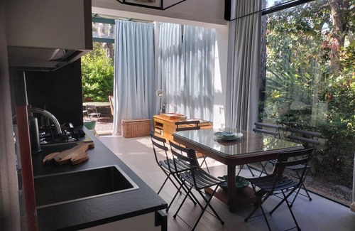 The house is composed as follows: from the garden you enter the living room, with glass walls and ceiling, surrounded by greenery. The environment is open to the modern kitchen, equipped with everything you need to cook and eat comfortably at home. A corridor leads to the sleeping area, with a bedroom with two bunk beds (4 beds) and a bathroom with shower and another bedroom with a double bed, walk-in wardrobe and en-suite bathroom with tub. From the double bedroom there is access to a small cloister where the laundry room is located, with washing machine and dryer. Behind the house there is a space designated for hanging out.