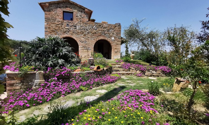 Ideal for three people, the villa is surrounded by olive groves and immersed among the Tuscan hills in the heart of Valdichiana. A strategic place to visit the beauties of Val d'Orcia and Chianti Sienese. The property has a large surrounding grounds and a private garden furnished with outdoor furniture to enjoy pleasant outdoor meals. From the terrace upstairs you can enjoy stunning views of the valley.