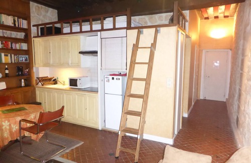 This VERY TYPICAL OLD PARISIAN apartment with visible stones and beams has ALL MODERN CONVENIENCES.