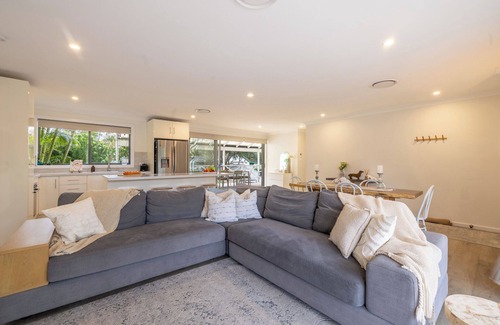 The open plan living, dining, and kitchen area is light-filled and spacious, making it the ideal place for family gatherings, shared meals, or lounging after a day at the beach. The kitchen is fully stocked with everything you need to entertain, from cooking essentials to platters and serving dishes for larger feasts.