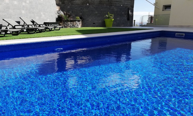 Holiday house in Funchal for family or group up to 12 people (9 adults and 5 children apto 8 years) near the city center (about 1.2 km) With nice size swimming pool and 150m2 surroundings: With external shower cold water and an internal hot water shower. It also has a poolside toilet. Although close to the Center it is in a quiet area, close to gardens. Nearby there is a bakery / patisserie, a grocery shop, a snack bar at 80 meters, and a hypermarket about 1 km. Overlooking the center and the bay of Funchal. It has 3 sleeping rooms and a spacious attic. One bedroom with double bed and cot with complete private toilet. Other 2 bedrooms with 2 single beds each. All bedrooms have fitted wardrobes. Full bathroom to support the rooms with single beds. A large attic with 7 single beds, 1 sofa bed, a cot, wardrobe and 3 dressers. a toilet with shower cabin in the attic.