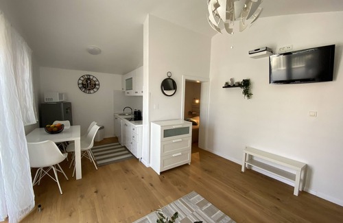 A2 apartment can accommodate up to 4 people. It has one bedroom with a twin-sized bed and a sofa in the living room area that can be used as a bed for two. The kitchen is fully equipped, including the dishwasher and the microwave oven. The apartment is on the first floor, the terrace offers you a view of both the sea and the mountains.