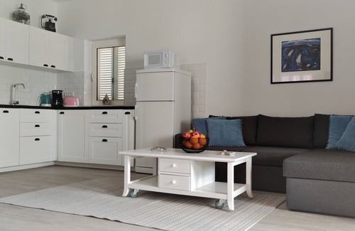 A4 apartment can accommodate up to 6 people. It has two bedrooms, one with a twin-sized bed, one with two single beds. The kitchen is fully equipped, including the dishwasher and the microwave oven. In the living room area there is a sofa that can be used as a bed for two people. The bathroom has a shower. The apartment is on the ground floor, has a terrace with glass walls and an adjacent garden table with a sea view.
