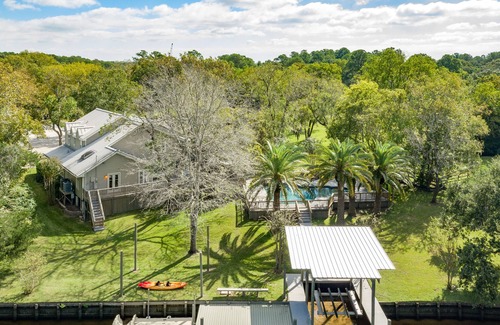 Perfect for families, small weddings/ceremonies, and corporate stays, this astonishing four-acre Benson Retreat offers an amazing getaway for all! Combining the main house with a pristine cottage, this property boasts an airy ambiance, ample natural light, and all of the comforts of home, ensuring that no one will have any trouble kicking back and slipping into total relaxation. Start each day with your morning coffee out on the furnished decks or at the dock as Dickinson Bayou flows gently by. The entire property is fenced, and you'll have no neighbors during your stay. When the temperature rises, sweet relief can be found in your private pool with plenty of room to suntan between refreshing dips. After full days of fun, enjoy two full kitchens with the equipment you need to prepare meals for the whole gang. Not to mention the free WiFi and large TVs that allow everyone to get online or enjoy their favorite movies or TV shows. When it's time to turn in for the night, you and your guests will have seven fantastic bedrooms to choose from - three in the cottage and four in the main house.