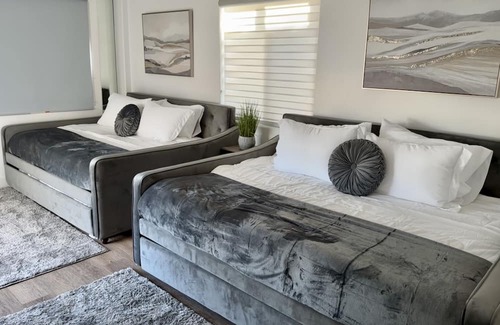 This property boasts a full kitchen with stainless steel Café appliances; Oven, Stove, Dishwasher, and microwave. With all the necessary utensils stocked for our guests to enjoy. The property also has covered parking in the garage, a designated space in front, and free street parking if needed. Central heating and air conditioning keeps the entire house cozy.
