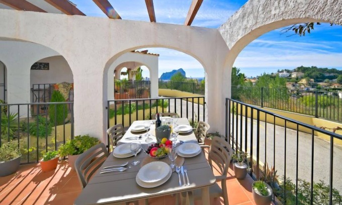 Imperial Park: Modern terraced house "Imperial Park". 3.3 km from the centre of Calpe, in a busy, sunny, elevated position, 2.5 km from the sea, 2.5 km from the beach. For shared use: large, well-kept terraced garden (fenced), natural garden, 3 swimming pools (seasonal availability: 01.Jan. - 31.Dec. pool opening hours: 10:00-20:00) with internal staircase. Unconventional pool shape. Children's pool, outdoor shower, patio, pergola, garden furniture. In the house: reception, lift. Shop 2 km, supermarket 2 km, restaurant 50 m, bar 200 m, café 50 m, bus stop 1.3 km, sandy beach "Playa De La Fosa" 3 km, diving center 1.5 km. Sports harbour 2.5 km, marina 2.5 km, golf course (18 hole) 10 km, surf school 2.5 km, sailing school 2.5 km, tennis 2.8 km, minigolf 3 km. Nearby attractions: Aqualandia, Mundomar, Terra Mítica, Terra Natura, y Benidorm Palace (Benidorm). Please note: car recommended. Reception open 10:00-15:00 hrs. Suitable for families. Please note: guarded residence. Additional accommodations can be booked. All houses/apartments are individually designed/furnished. Neighbourhood highly sensitive to noise. Quietness and good behaviour expected.