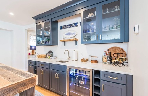 Originally built in 1886, this home has been a well-loved Wianno area summer home for well over a century. Its proximity to Dowses Beach and Osterville village center make it a very desirable location. The home was completely renovated top to bottom between 2020-2021, so our home has all the modern comforts that make a vacation that much more enjoyable. The new kitchen is open to the dining and bar area, to make family time more convenient. The casual high top table and wet bar face a big screen TV, making it a perfect place to watch the Red Sox and enjoy a meal. You will notice two more living rooms on the first floor, as well as a powder room. At the front of a house is the smaller TV den, and on the side is the large and more formal living room with loveseats and a piano. The wraparound porch is a great place to read a book or enjoy a cocktail.
