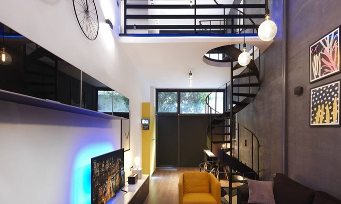 An industrial space turned into a digital nomad’s paradise! Split in 3 open space levels, with a ceiling as high as 10m , this urban space fills all your requirements. You will also have a big desk with a screen and a keyboard at your disposal.A 200 Mb fibre internet connection satisfies every digital need. The b/w color palette enriched with splashes of orange keeps you calm yet energised. On the ground level there is a spacious living room, a fully equipped kitchen and a dining area. On the lower level there is a bathroom and an office space that offers privacy, it includes a desk with a screen, a keyboard and lamp. On the top level a bedroom with a double bed nested by the window next to a beautiful tree, brings calmness.There are lots of great restaurants and coffee bars within a few minutes walk and on Saturdays there is a food market that takes place nearby. The apartment is situated in the middle of everything in a neighborhood full of life! Ideal for every type of guest!Agions Nikolaos tube station is a 10 minute walk, hop on the train and after one stop you will be ready to explore the historical center of Athens.Visit acropolis and Acropolis museum, shop at monastiraki, have a coffee at plaka, walk at Dionysiou Areopagitou, a splendid road at the feet of the Acropolis. The choices are endless!There are also many bus stations close to the apartment, with buses running 24/7 transporting you to every single spot in the city.The house has its own private entrance from the street.IF YOU WISH TO USE THE SOFA BED, PLEASE MAKE YOUR RESERVATION FOR 2-3 GUESTS!Please note that for check-ins between 21:00pm-23:00pm there is an extra 15€ fee paid in cash upon arrival.
