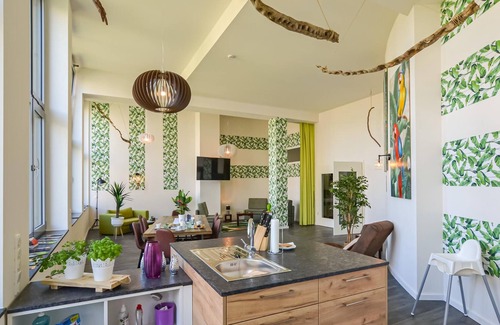 In the beautiful Saxon Switzerland, located between Dresden and Bad Schandau, a generously designed, unique loft apartment with flair awaits you directly at the quietly located castle park in the Elbe city of Pirna. The light-flooded loft on the second floor, is stylishly and exclusively furnished, offers space for 8 guests and is accessible via a large glass elevator. The large living area with integrated fully equipped kitchen cleverly combines modernity with wood and exudes a cozy atmosphere.