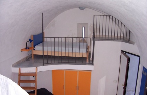 Here was the impressive old vault (a medieval observation saddle is still preserved) of living space on 2 levels obtained: living-dining area with sofa and Sat.-TV, Kitchenette (***, dishwasher provided), balcony with expansive sea views, 2 galleries with double bed, or Single bed, small. Bedroom with pull-out bed and bathroom (shower); an internal staircase leads to the upper floor: spacious Eckschlafzimmer overlooking from high above the harbor, terrace with spectacular sea views and very nice bathroom with shower brick. The equipment is good and new, adapted to the setting, the apartment is equipped with gas stove only partially heated, insulated windows.