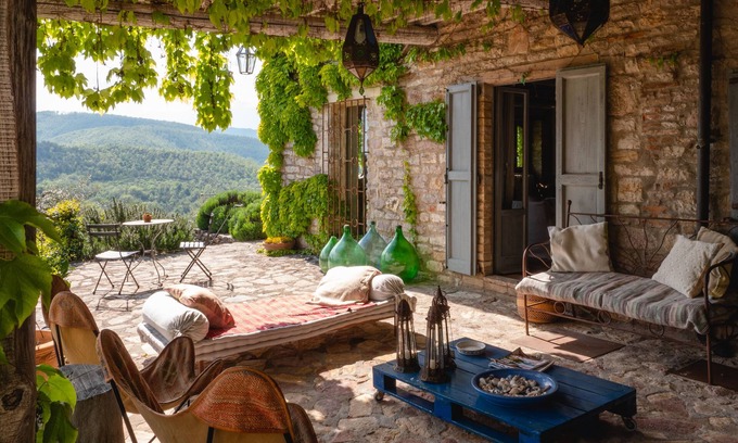 The house is spacious and full of light. In the sitting room, cool breezes pass through the open doors that lead to the garden and tower. The kitchen is fully equipped with an adjoining dining room (for 12). Lunch and dinners are usually served outside (one table seats 6, the other 12). A variety of outdoor seating areas surround the house offering privacy and silence. A loggia by the tower offers a relaxing space to watch the sunset. A lounge area outside the dining room offers the confort of a living room while enjoying the breathtaking views. An organic vegetable garden provides seasonable salads and vegetables and the estate also produces its own biological olive oil. The only little shop in the village offers typical gourmet products from local farmers. Just 1.5 kilometers away, Antognolla Castle overlooks the 18-hole championship golf course designed by Robert Trent Jones J.