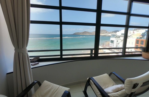 Spacious and super bright apartment with stunning views over the famous Las Canteras beach and the privilege of unforgettable magical sunsets with the volcano Teide as a backdrop, thanks to its glass façade that also gives the feeling of being on a boat, enjoying the sea at your feet.