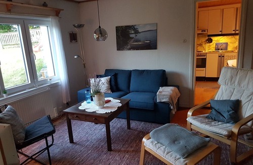 The 85 square meter blue wooden house is newly renovated and stands on a 1000 square meter large and hilly property. From there you have a great view of the beautiful town of Norrhult.