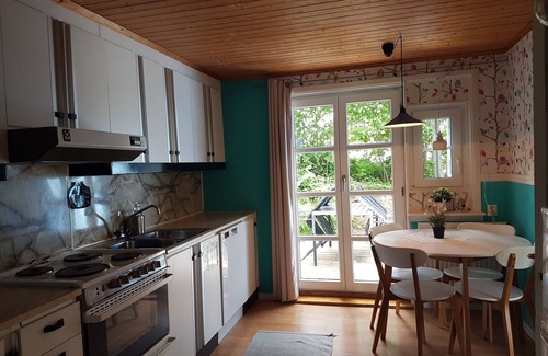 It is attractive, modern, but also cozy and typically Swedish. Through the hallway you reach a cozy living room, from there you can reach one of the bedrooms, the eat-in kitchen and the cozy attic. If you prefer to enjoy your coffee in the morning or evening sun, you can access the sun terrace via the kitchen-cum-living room. From the hall you can access another bedroom and the bathroom with a bathtub. All rooms are friendly and bright and equipped with windows.